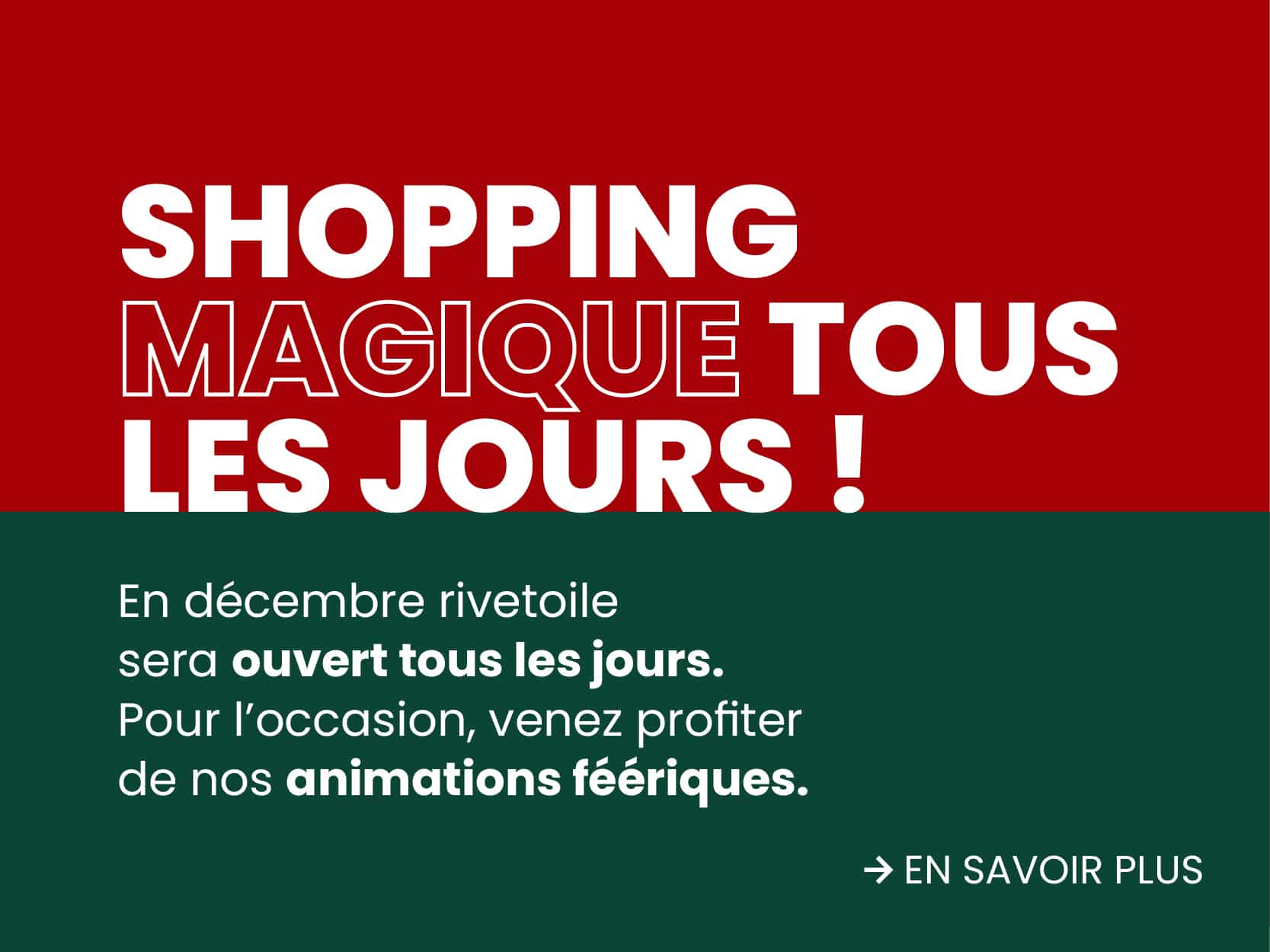Erleben Sie vom 17. November 2025 bis zum 3. Januar 2026 die Magie der Weihnachtszeit in Ihrem Einkaufszentrum Rivetoile in Straßburg. Der Weihnachtsmann, der Nikolaus, ein Workshop zum Schreiben von Briefen an den Weihnachtsmann, Schminkworkshops und vieles mehr erwarten Sie im Rivetoile!